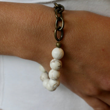 This bracelet packs a surprise with it's stretchy goodness! The chain detail makes it so much fun! Vintage brass chain mixed with either white or flower jade gemstones. Really, anything goes with Granny Law right!