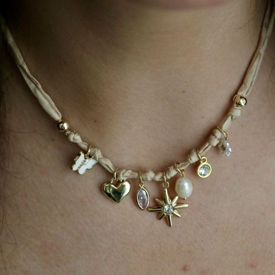 A new fresh take on a charm necklace! The hand-dyed ivory silk cord makes a beautiful backdrop for the fun selection of charms we chose to adorn this piece. Casual, fun piece on it's own or a short layer to add to your stack!