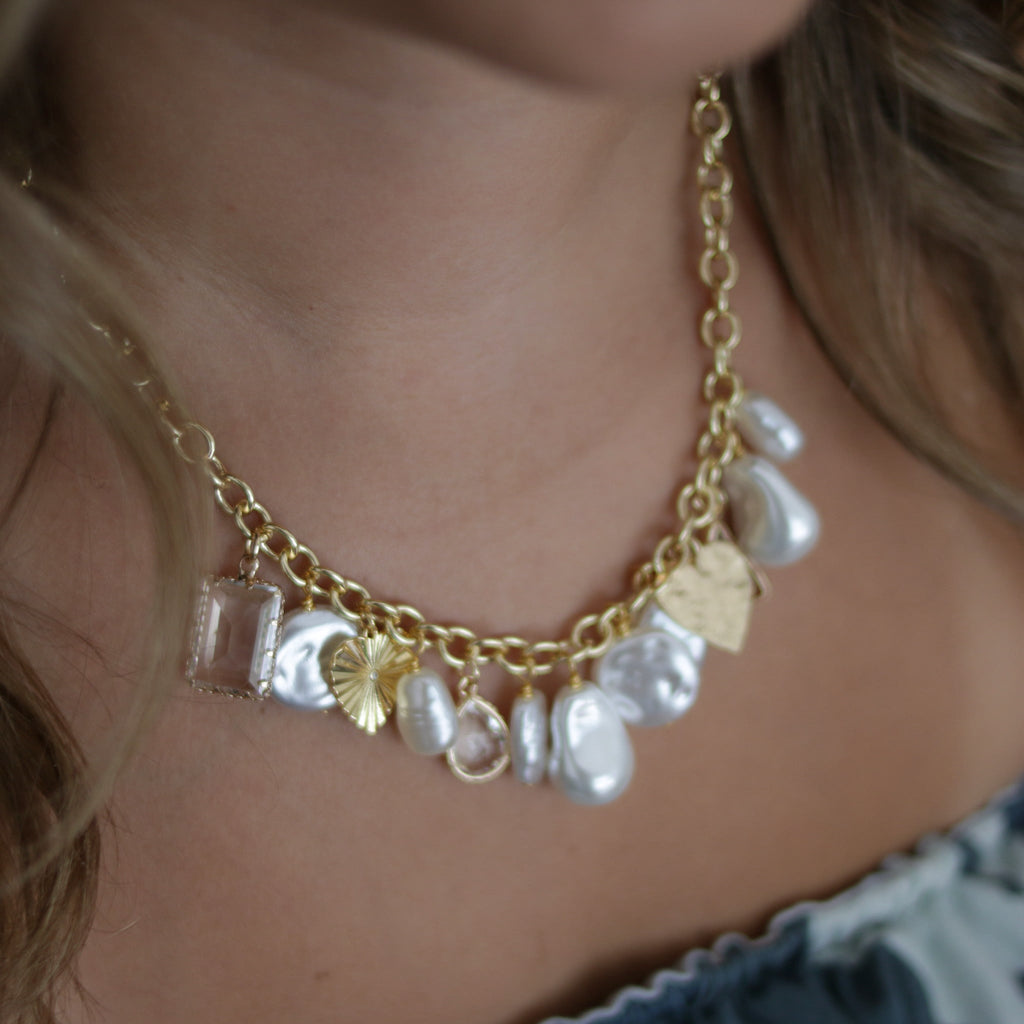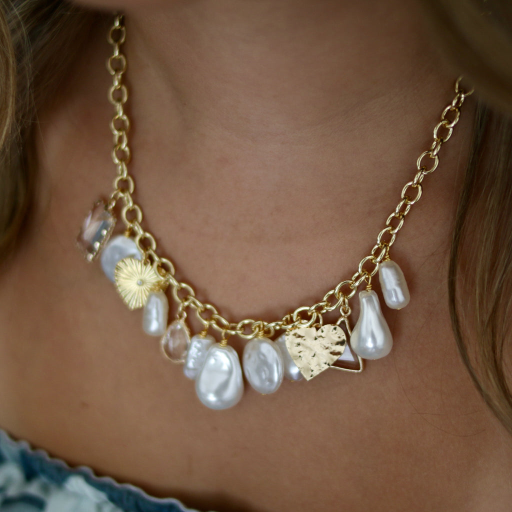 This gorgeous necklace is the ultimate charm necklace! With all the pearls, crystals and some pretty hearts to finish out the mix. This hits the trend of the poplular charm necklace in a way that makes us very happy so we named her the Joyful Necklace for a reason!