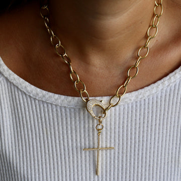 The Beacon Necklace shines like a fabulous star. The CZ clasp in the front is the focal you didn't know you needed! The gorgeous rhinestone Cross can be removed for an entirely different look with this piece. Designed with gold-plated chain, we added a clasp in the back to make wearing it even easier.