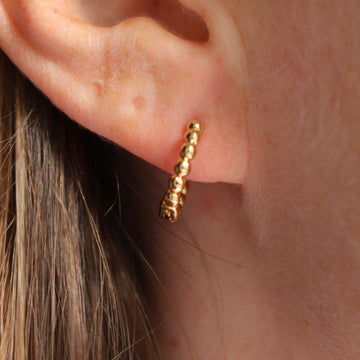 This sweet gold huggie is a great addition to any earring stack. The tiny dot detail makes this one stand out from other earrings and looks great
