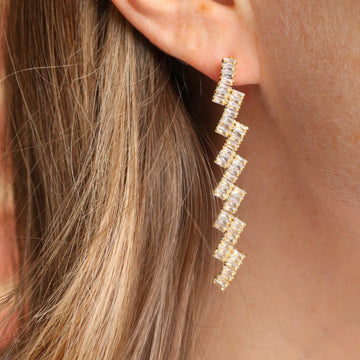 Turn heads in our Shine Bright Zigzag Baguette CZ Earrings. Designed with cascading baguette-cut cubic zirconia stones in a striking zigzag silhouette, these earrings bring bold sparkle and modern edge to any look.