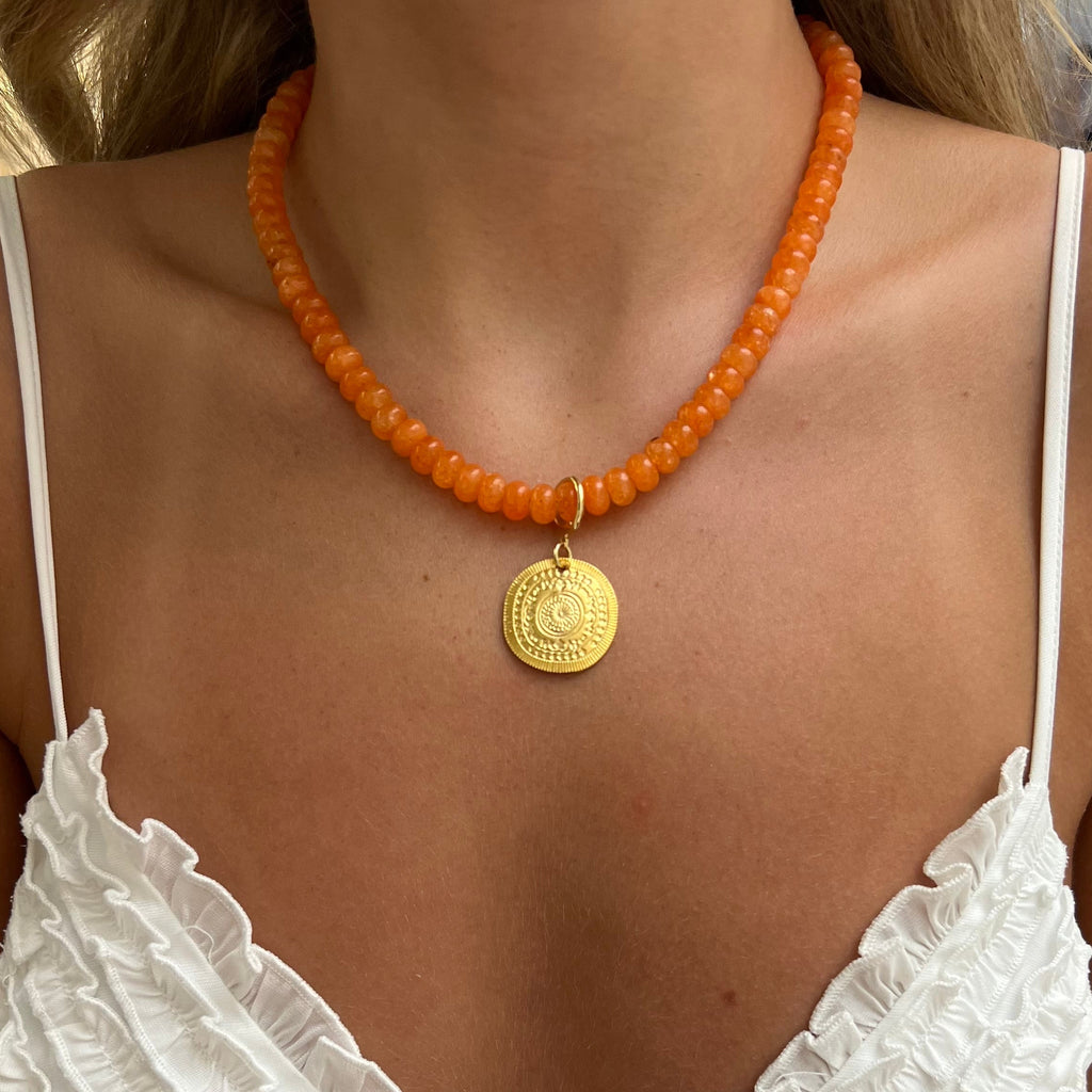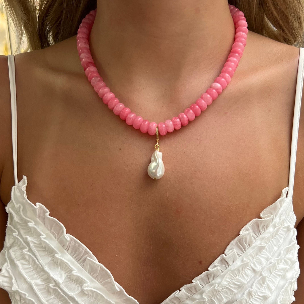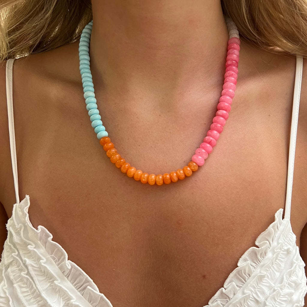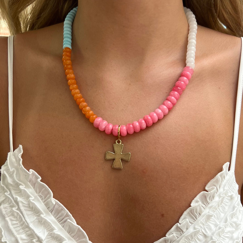 Each colorful strand is filled with gemstone beads and can be customized with your choice of one of four charms — a heart, coin, cross, or pearl.