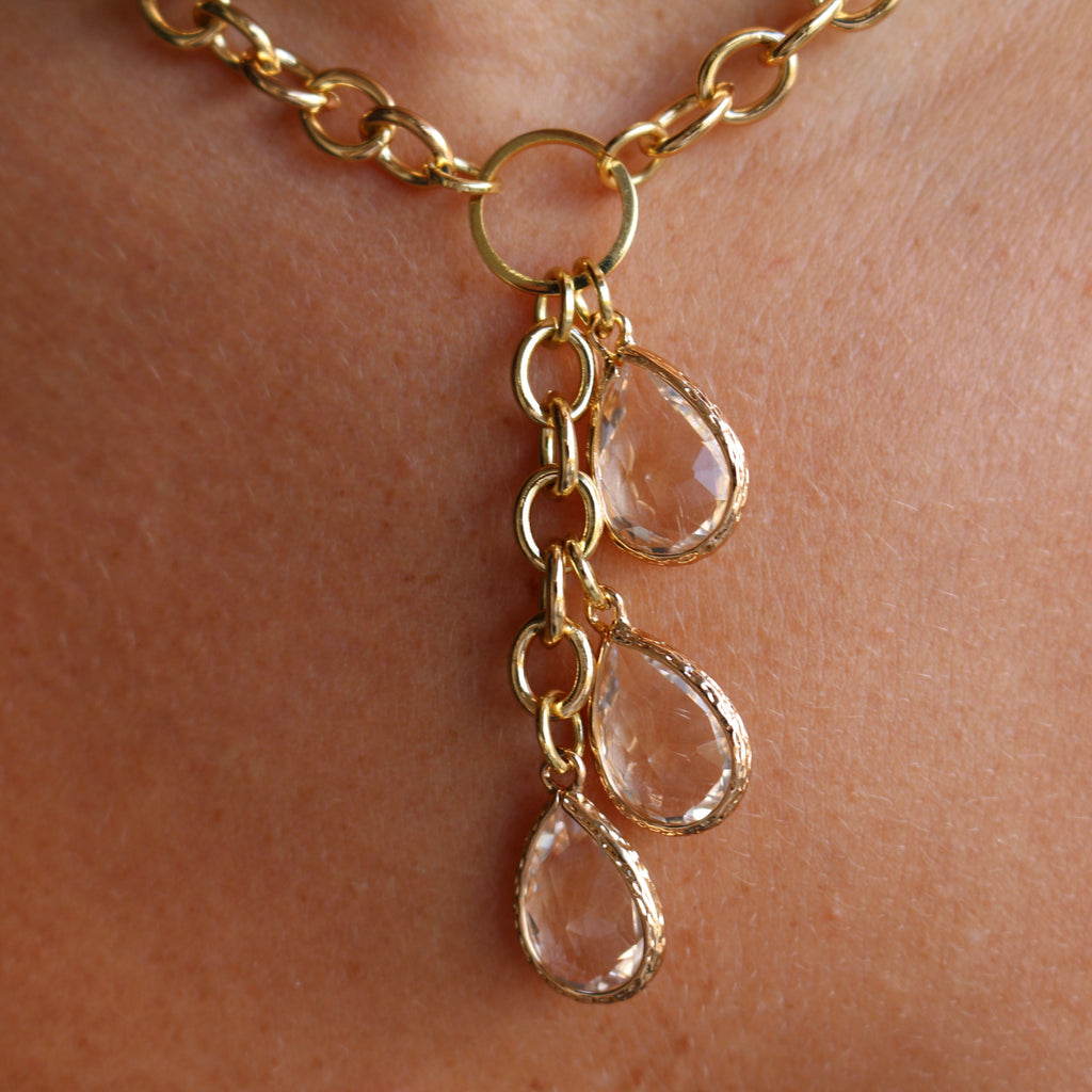 This 16" gold plated necklace features a three crystal drop that gives off a party vibe! We will wear this one with our jeans and t-shirt and our best dresses! The teardrop crystals reminded us of "angel rays" coming out of a cloud. It's a sign that you should get this necklace!