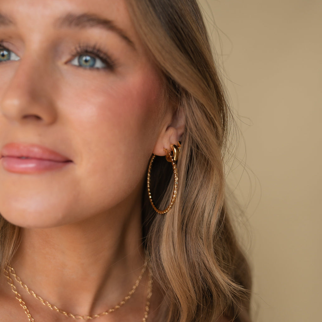 These gorgeous 16k gold filled 50mm hoops are what dreams are made of! The texture of the earring makes them unique but still a classic take on the hoop! We can't live without these!